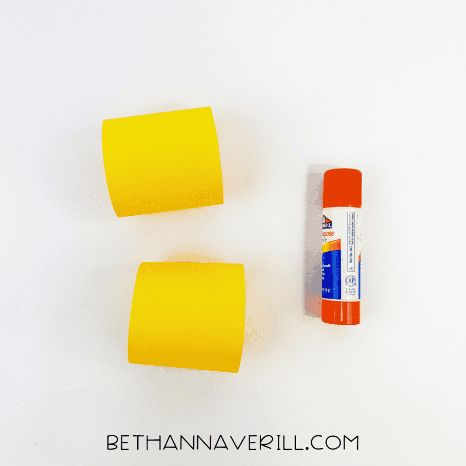 - Create the chick's body: Cut two strips from yellow construction paper, roll each strip, and glue the ends together to form two loops.