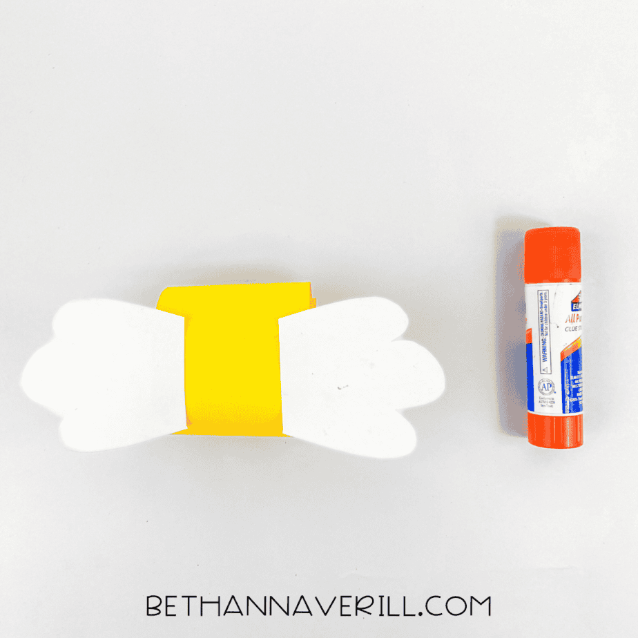 - Make the wings: From white construction paper, cut out two wings and glue them to one of the yellow loops.