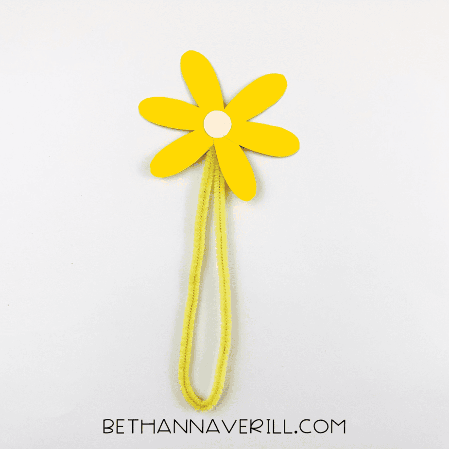 - Make the flower stems: Fold a pipe cleaner in half to create a loop. Glue each flower to the two loose ends of the folded pipe cleaner so the loop becomes the flower stem.