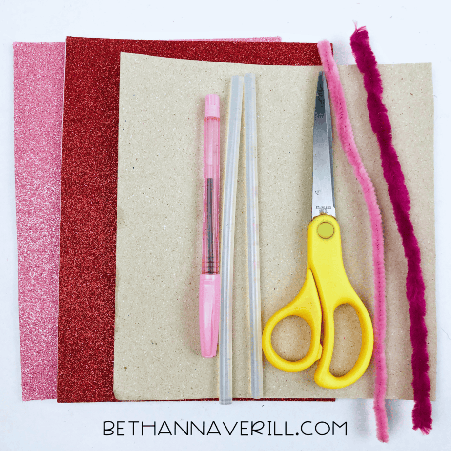 - Gather your supplies. You will need white construction paper, pink sparkly construction paper, red sparkly construction paper, pink and red pipe cleaners, scissors, glue, and a pencil.