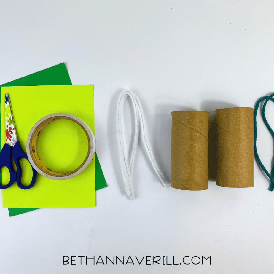 - Gather your supplies. You will need two toilet paper rolls, green construction paper, white pipe cleaners, scissors, glue or tape, clover-shaped cutouts from green paper, and yarn.
