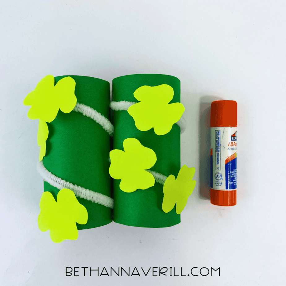 - Add the clovers. From light green construction paper, cut out a bunch of small clover shapes. Glue these clovers on top of the toilet paper rolls.