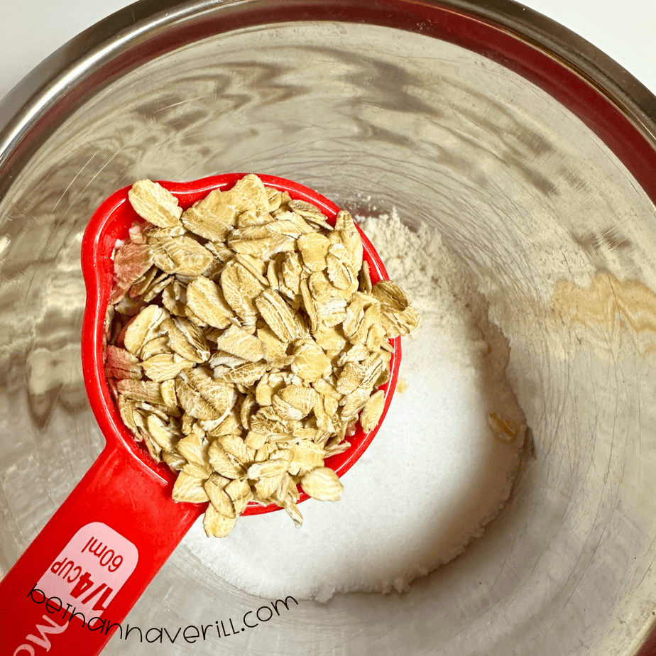 - In a mixing bowl mix 1/2 cup of flour, 1/4 cup of salt, and 1/4 cup of oats.