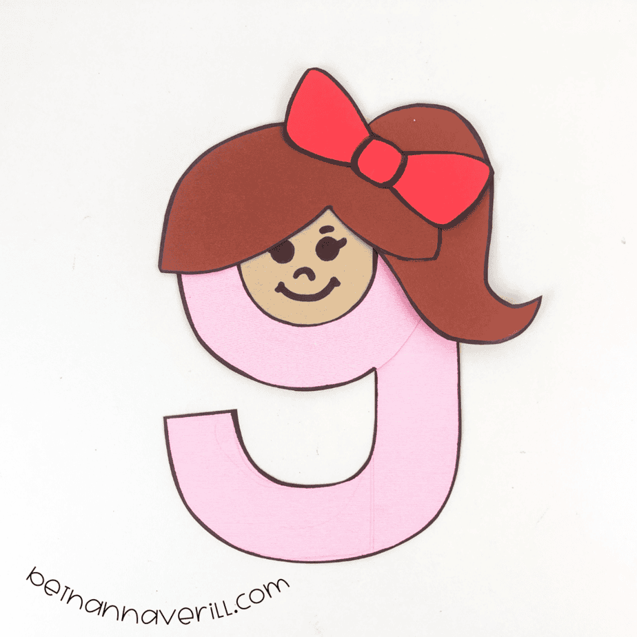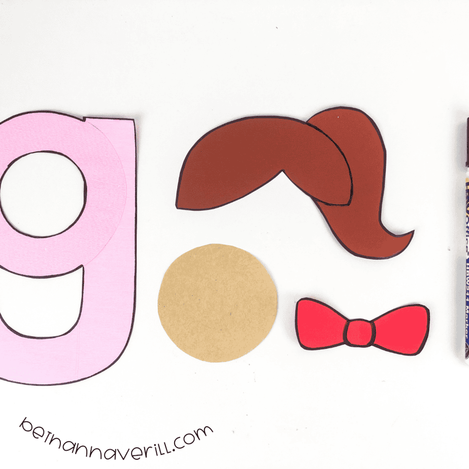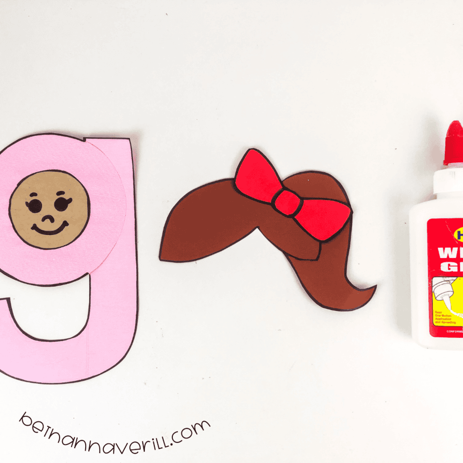 - Glue the hair, bow, and the face of the girl onto the letter g. Use a marker to draw a face onto your girl.