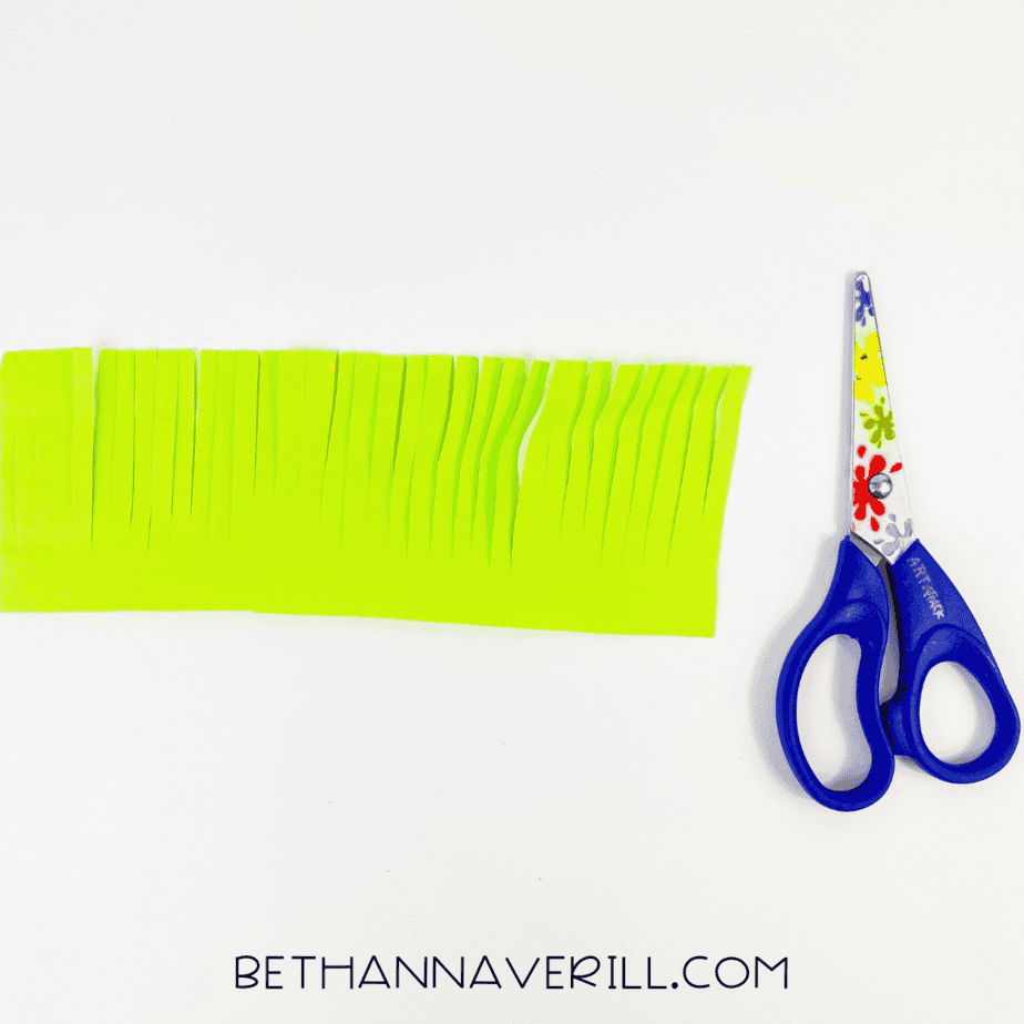 - Create the grass: Cut a strip of green construction paper. On one side, make cuts to create a grass-like design, leaving about 1/2 inch from the base of the strip.