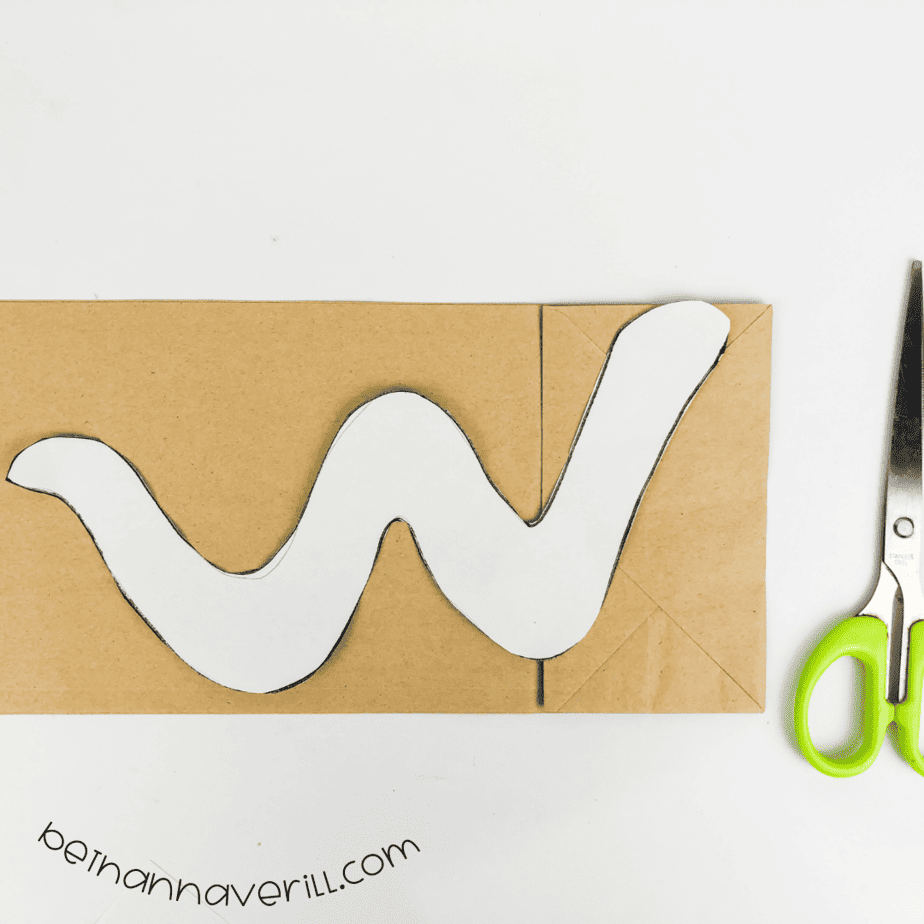 - Grab your scissors and carefully cut out the template of our wiggly friend, the Letter W (aka our wormy buddy).